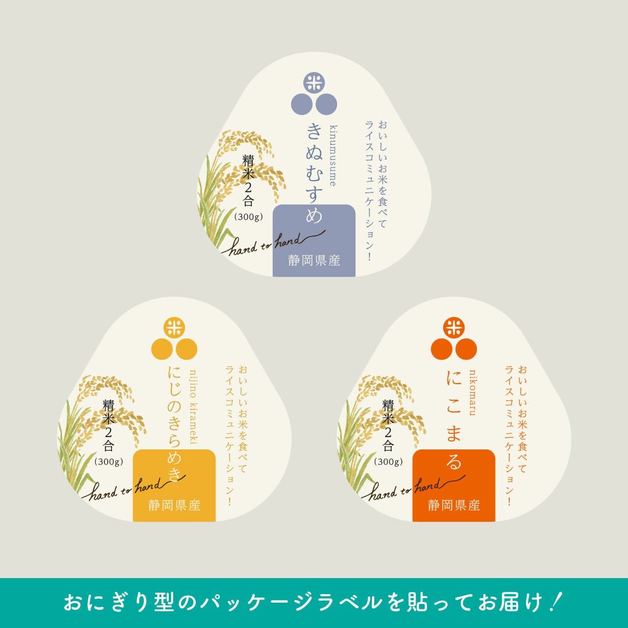 地域資源の竹を活用した竹パウダー・竹炭を使用し、農薬を減らして栽培した自慢のお米を食べ比べられるお試しセットです。おにぎり型のパッケージラベルが目印!